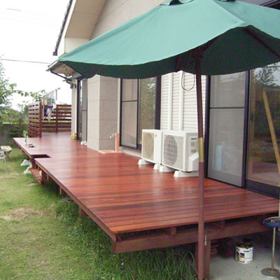 ウッドデッキを素足で使用したい、それも高耐久材で、となればこのアフゼリア以外にはほぼ流通しておらず、きわめて特徴的なウッドデッキ材といえます。