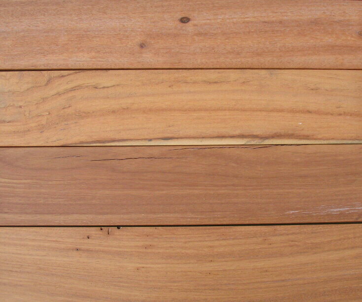 樹高30〜40m、直径は1〜1.5mの大径木ですが、曲がりが多いため、長尺材は多くありません。材は薄茶色で、乾燥すると赤褐色になります。木肌はなめらかで光沢があり、狂い・割れが少なく、表面は極めてなめらかな仕上がりになります。