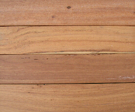 一般ハードウッドのひび(拡大) 繊維に粘りがありつながっているので、雨風で樹脂分が流れ落ちると徐々に剥がれて鋭いトゲになります。 |