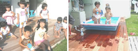 アフゼリアは寸法安定性が極めて高く、フローリングにして無塗装のまま床暖房に使用している例があるほどです。他のウッドデッキ材に較べてひび割れが10分の1以下しか出ず、またささくれができても、繊維が砕けやすいので先端が雨風に当たるだけで欠けてしまい、肌に突き刺さるような鋭いトゲになりにくいのが特徴です。材自体も比較的柔らかいので、常時、素足歩行となる浴室や露天風呂、プールサイドにも、桧材と同様に安心して使えます。また、適度な硬さなのでサンドペーパーをかければなめらかになります。小さなお子さんがリビングから靴を履かずにそのままデッキに出る作りでも安心して遊ばせることができます。表面はモルダー加工に加え、一般のウッドデッキ材には行われない120番のサンダー仕上げが施され、すべすべの肌触りです。幼稚園や海辺のウッドデッキ、小さなお子さんやワンちゃんのいるテラスなど、素足での歩行が多いあらゆる場所にお勧めします。